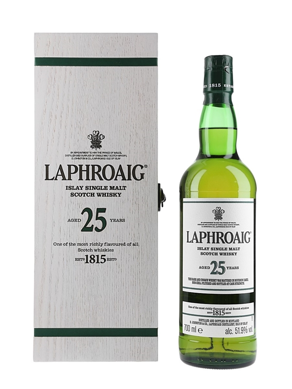A bottle of Laphroaig 25 Year Old Islay Single Malt Scotch Whisky produced by D. Johnston & Co. This was matured in Bourbon Casks, and bottled in 2021 at a cask strength of 51.9% ABV.