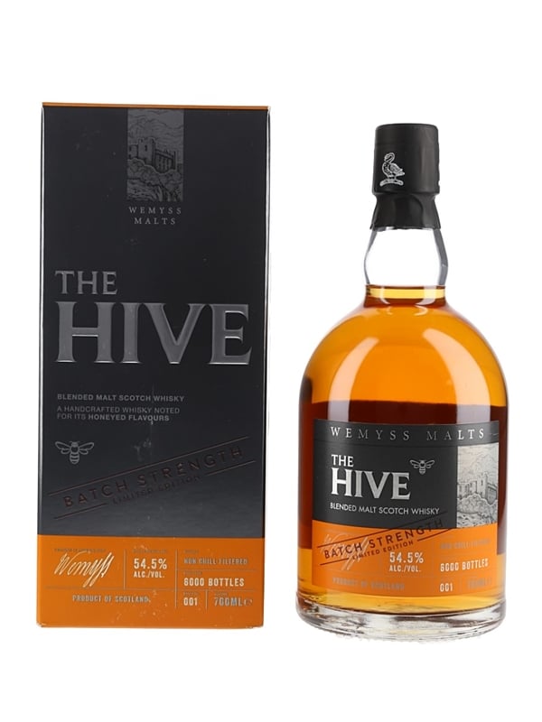 A limited edition bottle of The Hive Batch #001 Blended Malt Scotch Whisky. This was bottled at 54.5% ABV batch strength by Wemyss Malts.