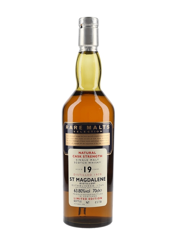 A bottle of St Magdalene 19 Year Old single malt Scotch whisky. This was distilled in 1979 and released in October 1998 as part of Diageo's now discontinued Rare Malts range.