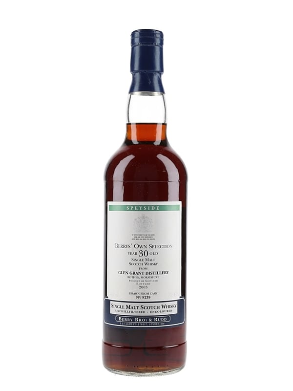 A bottle of Glen Grant 30 Year Old Single Malt Scotch Whisky. This was matured in a single cask and bottled at 46% ABV in 2003 by Berry Bros & Rudd for the Berry's Own Selection series.