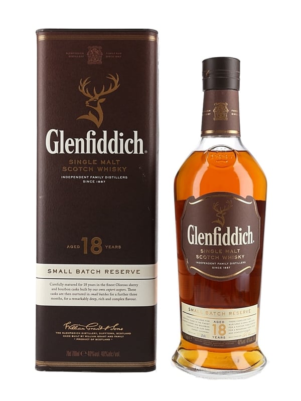 A bottle of Glenfiddich 18 Year Old Small Batch Reserve Single Malt Scotch Whisky.