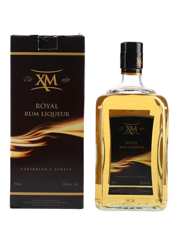 A bottle of XM Royal Rum Liqueur, blended, bottled and exported by D' Aguiar's Industries and Holdings, Georgetown, Demerara, Guyana.