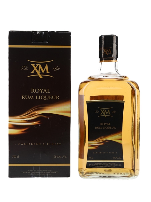 A bottle of XM Royal Rum Liqueur, blended, bottled and exported by D' Aguiar's Industries and Holdings, Georgetown, Demerara, Guyana.