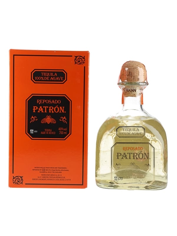 A bottle of Patron Reposado, a premium Tequila made from 100% Weber blue agave.