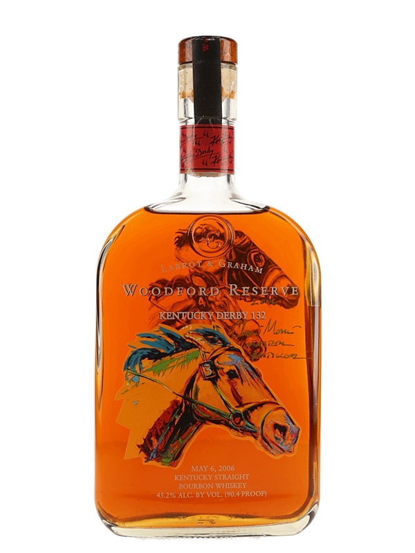 A litre bottle of Woodford Reserve Kentucky Straight Bourbon Whiskey produced by Labrot & Graham. This was specially bottled for the Kentucky Derby 132 in 2006.
