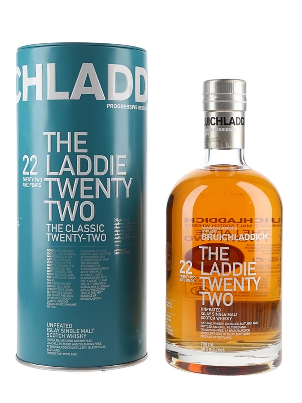 A bottle of The Laddie Twenty Two, a single malt Scotch whisky from Islay's Bruichladdich distillery which was matured in American oak barrels for 22 years before bottling.