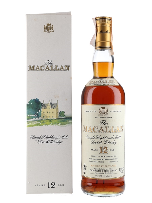 A bottle of The Macallan 12 Year Old Single Highland Malt Scotch Whisky. This was imported to Italy by Giovinetti & Figli, we estimate in the 1980s to early 1990s.