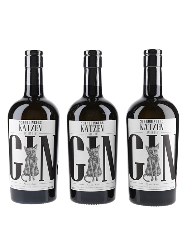 This lot contains three bottles of Schrodinger's Katzen London Dry Gin produced in Germany by Heidelberg Spirits. These are from batch 024, and were bottled in April 2021.