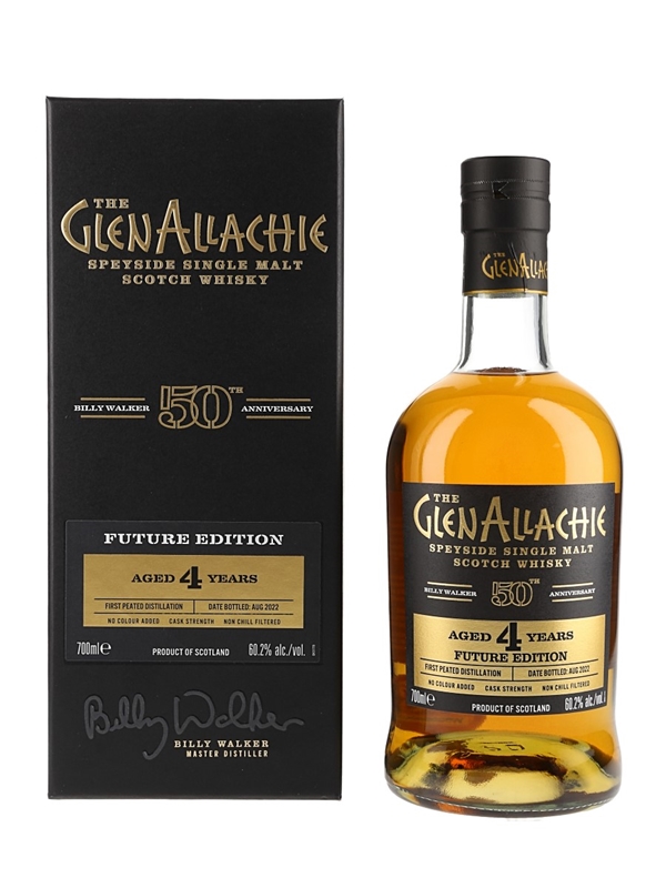 A limited edition bottle of The Glenallachie 4 Year Old Future Edition Speyside Single Malt Scotch Whisky, First Peated Distillation. This was bottled at a cask strength of 60.2% ABV in August 2022 to celebrate Master Distiller Billy Walker's 50 years working in the whisky industry.