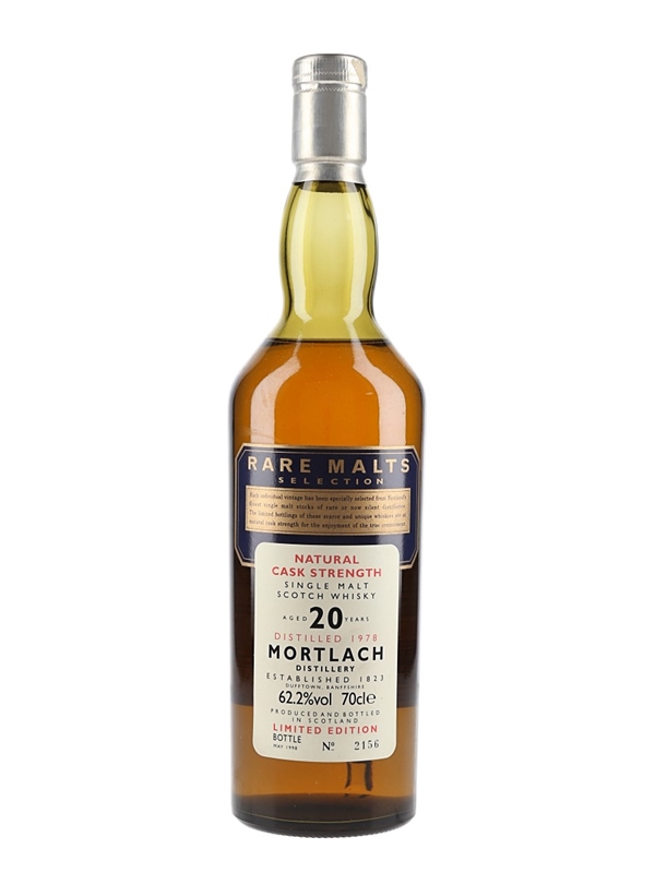 A bottle of Mortlach 20 Year Old Natural Cask Strength Single Malt Scotch Whisky. This was distilled in 1978 and bottled for Diageo's now-discontinued Rare Malts Selection in May 1998.
