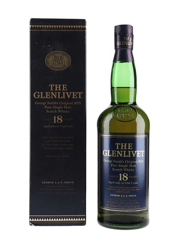 A bottle of The Glenlivet 18 Year Old Pure Single Malt Scotch Whisky produced by George & J.G. Smith and bottled at 43% ABV. We estimate this was bottled in the late 1990s to early 2000s.