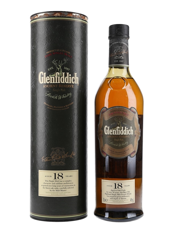 A bottle of Glenfiddich 18 Year Old Ancient Reserve Rare Old Pure Single Malt Scotch Whisky.