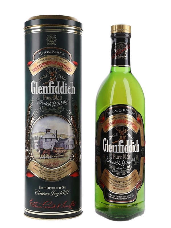 A bottle of Glenfiddich Special Old Reserve Single Pure Malt Scotch Whisky distilled and bottled by William Grant & Sons Ltd. We estimate this was bottled in the 1980s.