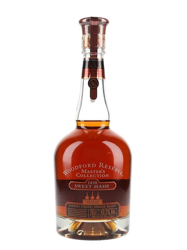 A bottle of Woodford Reserve 1838 Sweet Mash Copper Pot Stilled Kentucky Straight Bourbon Whiskey, released as part of the Master's Collection. This was produced in small batches with the addition of sweet mash from previous fermentations.