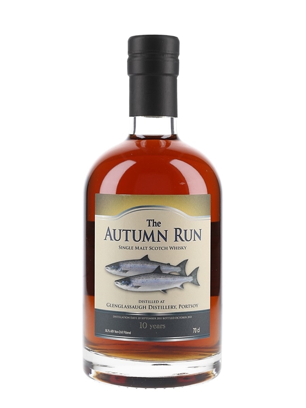 A bottle of Glenglassaugh 10 Year Old The Autumn Run Single Malt Scotch Whisky. This was distilled in September 2011, matured in a first fill oloroso sherry butt and bottled at cask strength in October 2021.