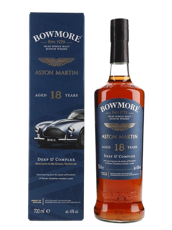 A bottle of Bowmore 18 Year Old Islay Single Malt Scotch Whisky made in collaboration with Aston Martin. This was matured in a combination of Oloroso and Pedro Ximenez Sherry casks.