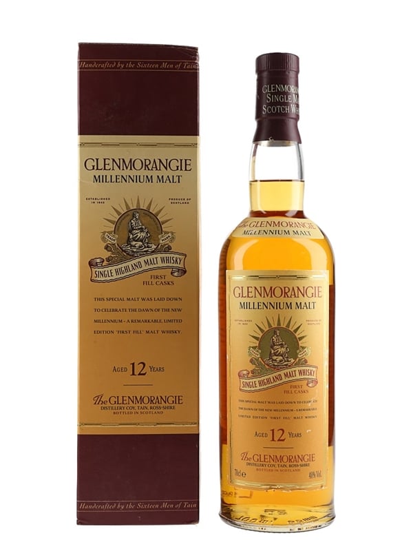 A bottle of Glenmorangie 12 Year Old Millenium Malt First Fill Casks Single Highland Malt Scotch Whisky, matured in first fill casks and bottled to celebrate the new millennium. The bottling code indicates this was bottled in 1999.