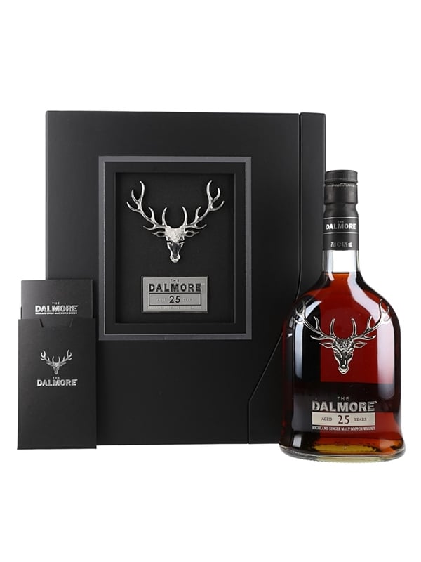 A bottle of Dalmore 25 Year Old Highland Single Malt Scotch Whisky. This was matured in American white oak before a second maturation in a combination of Palomino Fino sherry butts and 1980 first fill bourbon casks. These were than married together in bourbon barrels before a finishing period in Tawny Port pipes.