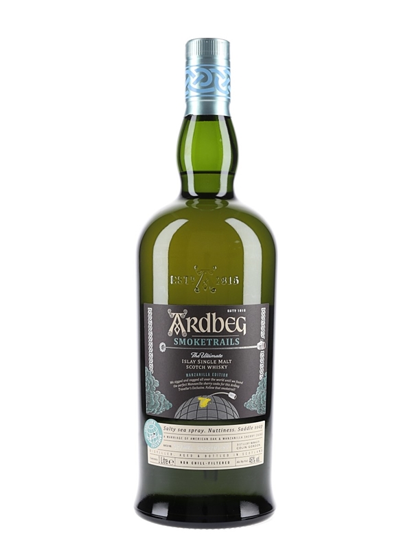 A litre bottle of Ardbeg Smoketrails Islay Single Malt Scotch Whisky, a Traveller's Exclusive matured in American oak and Manzanilla sherry casks. This is from batch number SP/MZL: 2022/01-ST.