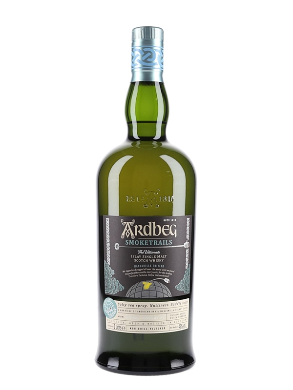 A litre bottle of Ardbeg Smoketrails Islay Single Malt Scotch Whisky, a Traveller's Exclusive matured in American oak and Manzanilla sherry casks. This is from batch number SP/MZL: 2022/01-ST.