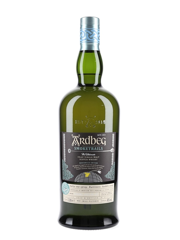 A litre bottle of Ardbeg Smoketrails Islay Single Malt Scotch Whisky, A Traveller's Exclusive matured in American oak and Manzanilla sherry casks. This is from batch number SP/MZL: 2022/01-ST.