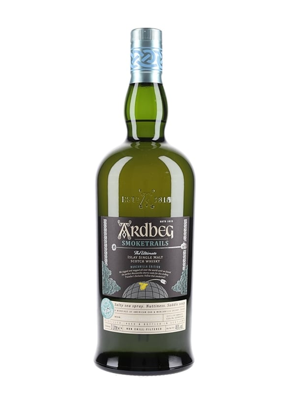 A litre bottle of Ardbeg Smoketrails Islay Single Malt Scotch Whisky, A Traveller's Exclusive matured in American oak and Manzanilla sherry casks. This is from batch number SP/MZL: 2022/01-ST.
