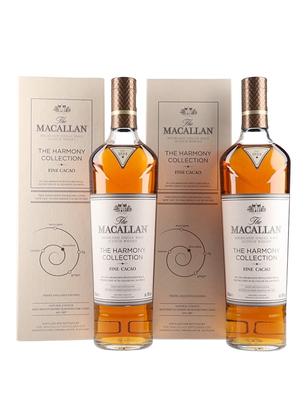 This lot contains two bottles of The Macallan Fine Cacao Highland Single Malt Scotch Whisky from The Harmony Collection. This is inspired by the chocolate creations of Spanish chef Jordi Roca, pastry chef at El Celler de Can Roca. The restaurant was twice voted best restaurant in the world.