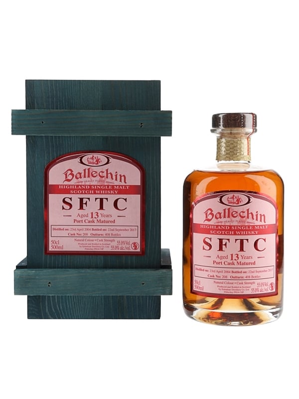 A 50cl bottle of Ballechin 13 Year Old SFTC Highland Single Malt Scotch Whisky. This was distilled on 23 April 2004, matured for 13 years in an Port cask and bottled at a cask strength of 55% ABV on 22 September 2017 by Edradour Distillery Co. Ltd.