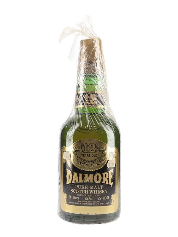 A bottle of Dalmore 12 Year Old, presented in its original plastic wrapping, with a black and gold label and box. We estimate this was bottled in the 1970s.