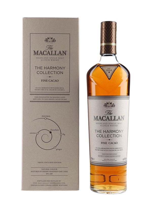 A bottle of The Macallan Fine Cacao Highland Single Malt Scotch Whisky from The Harmony Collection. This is inspired by the chocolate creations of Spanish chef Jordi Roca, pastry chef at El Celler de Can Roca. The restaurant was twice voted best restaurant in the world.