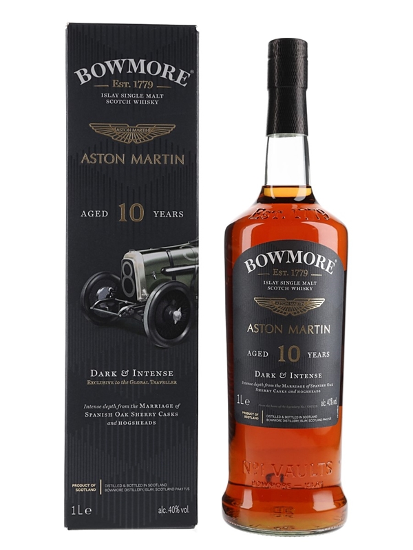 A bottle of Bowmore 10 Year Old Islay Single Malt Scotch Whisky made in collaboration with Aston Martin. This was matured in a combination of Sherry casks and Hogsheads.