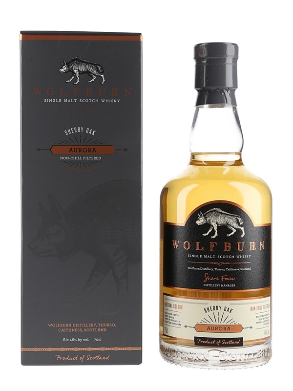 A bottle of Wolfburn Sherry Oak Aurora Single Malt Scotch Whisky.