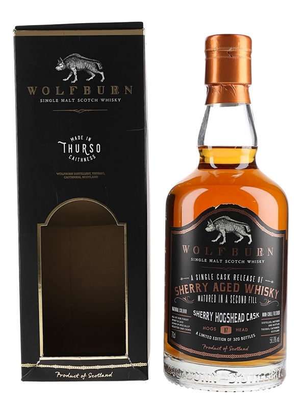 A bottle of Wolfburn Single Cask Release Sherry Aged Single Malt Scotch Whisky.