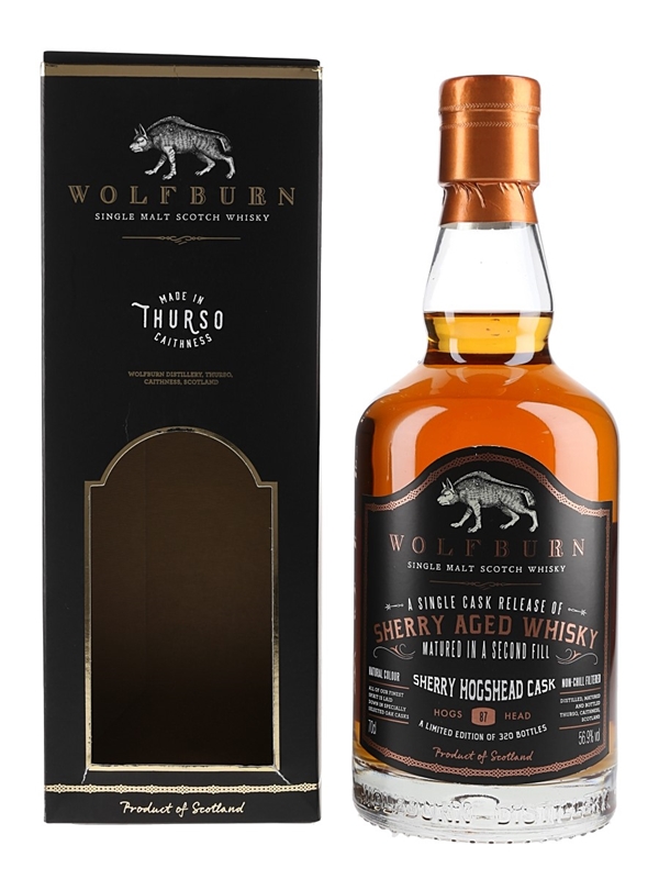 A bottle of Wolfburn Single Cask Release Sherry Aged Single Malt Scotch Whisky.