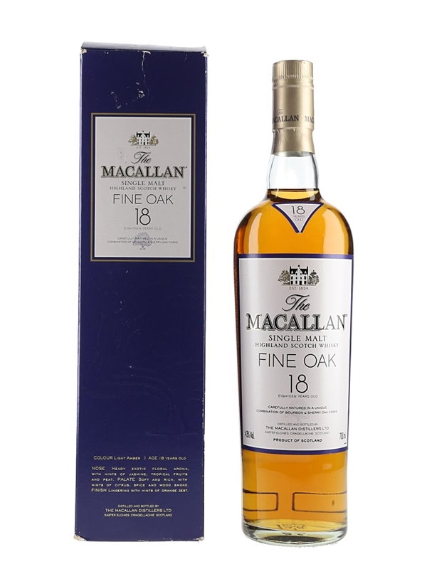 A bottle of The Macallan 18 Year Old Fine Oak Single Malt Highland Scotch Whisky. This was matured in a combination of bourbon and sherry oak casks prior to bottling at 43% ABV.