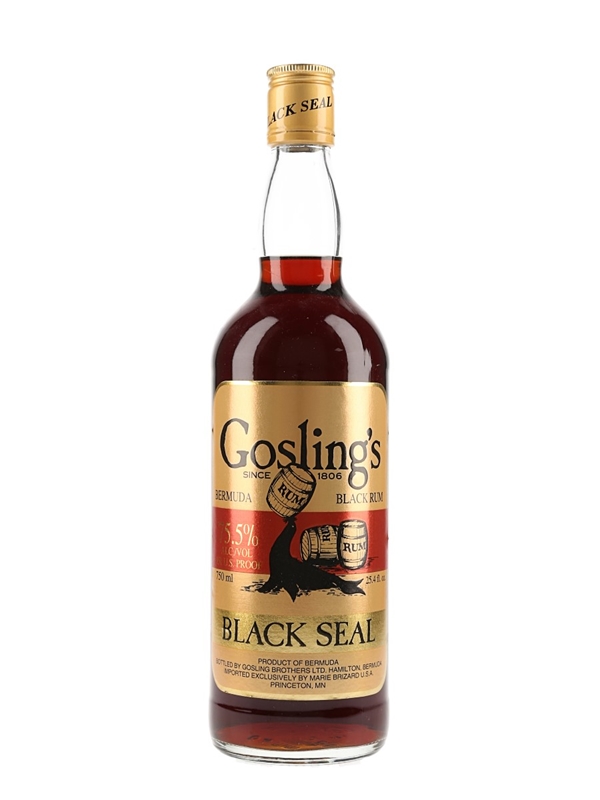 A bottle of Goslings Black Seal 151 Proof Black Rum, produced in Bermuda and bottled at 75.5% ABV. This was imported exclusively by Marie Brizard USA, Princeton, MN.