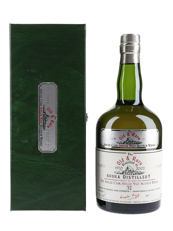 A bottle of Brora 32 Year Old Single Cask Single Malt Scotch Whisky. This was distilled in 1970, matured in a single cask and bottled at a natural cask strength of 58.4% ABV in 2002 by Douglas Laing & Co. Ltd. for the Old & Rare Platinum Selection series.