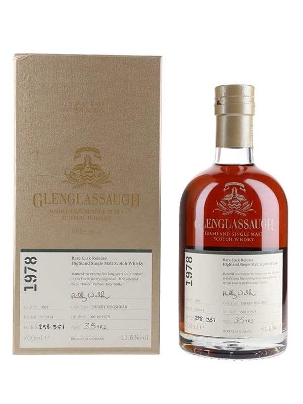 A bottle of Glenglassaugh 35 Year Old Rare Cask Release Highland Single Malt Scotch Whisky. This was distilled on 6 October 1978, finished in a Sherry hogshead and bottled at 41.6% ABV in February 2014 as a Rare Cask Release.