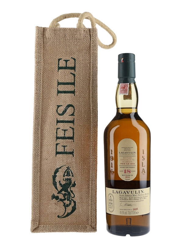 A bottle of Lagavulin 18 Year Old Islay Single Malt Scotch Whisky released for Feis Ile 2016. This was matured in refill American oak hogsheads and European oak Bodega sherry butts. It was bottled at a cask strength of 49.5% ABV in 2016 to celebrate the 200th anniversary of Lagavulin distillery and released for Feis Ile 2016.