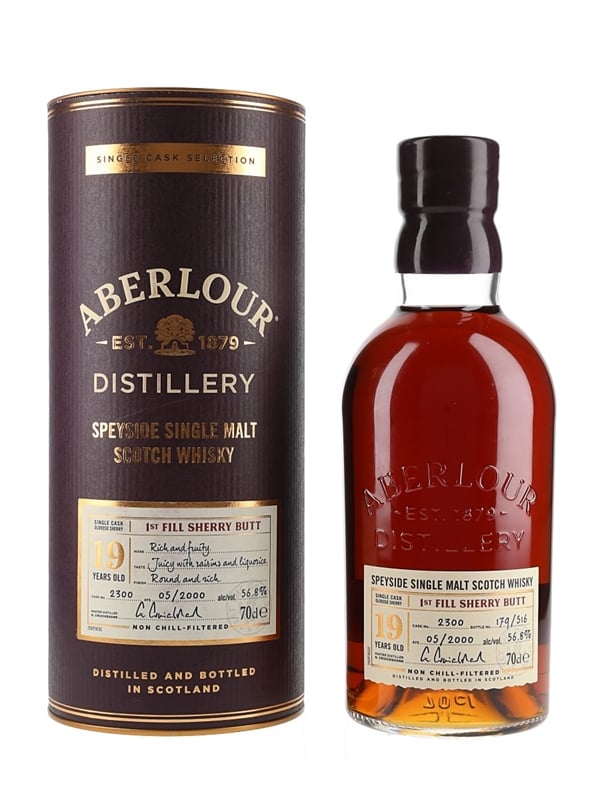 A bottle of Aberlour 19 Year Old Single Cask Speyside Single Malt Scotch Whisky. This was distilled in May 2000 matured in a single oloroso sherry butt before being bottled at 56.8% ABV.