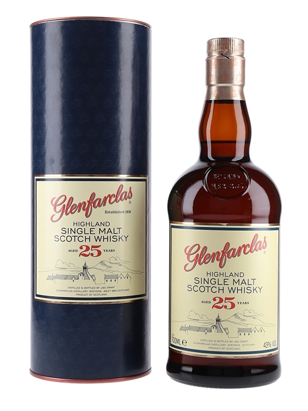 A bottle of Glenfarclas 25 Year Old Single Highland Malt Scotch Whisky.