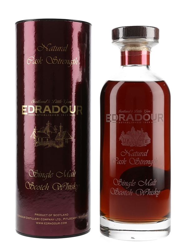 A bottle of Edradour Natural Cask Strength Single Malt Scotch Whisky. This was distilled on 20 June 2005, matured in a single cask and bottled at natural cask strength on 21 August 2018.