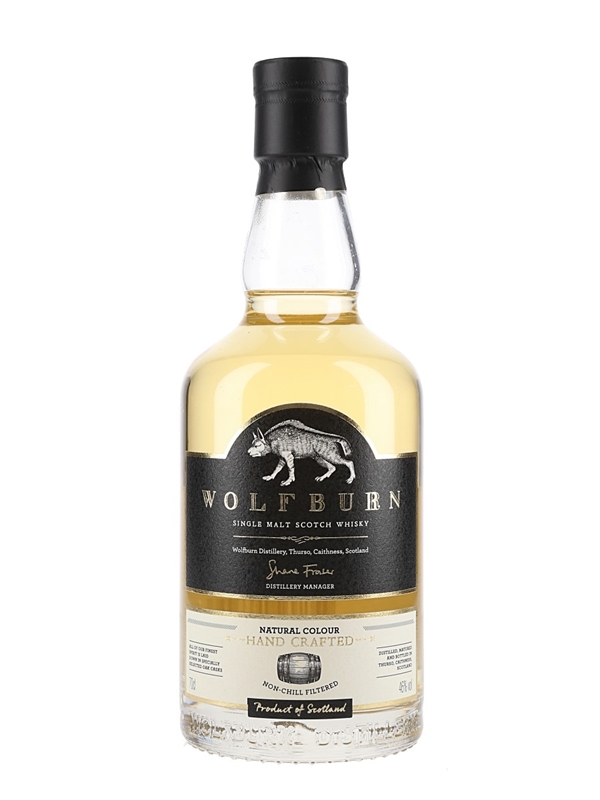 A bottle of Wolfburn Hand Crafted Northland Single Malt Scotch Whisky.