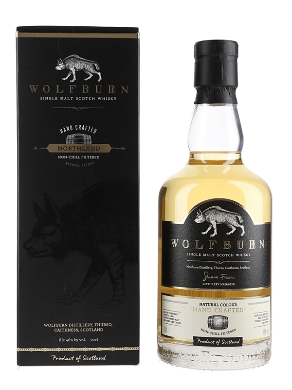 A bottle of Wolfburn Hand Crafted Northland Single Malt Scotch Whisky.