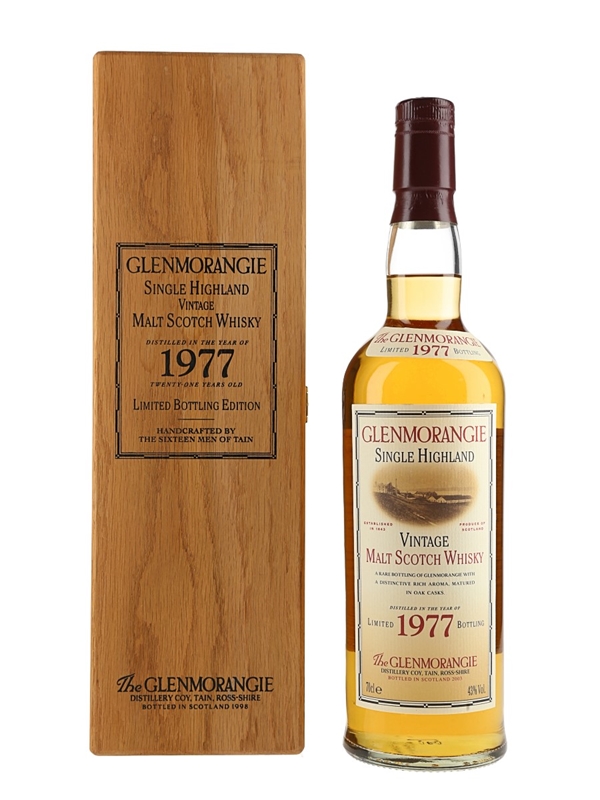A limited edition bottle of Glenmorangie Vintage 1977 Single Highland Malt Scotch Whisky, matured in American oak barrels for 21 year old and bottled in 2003.