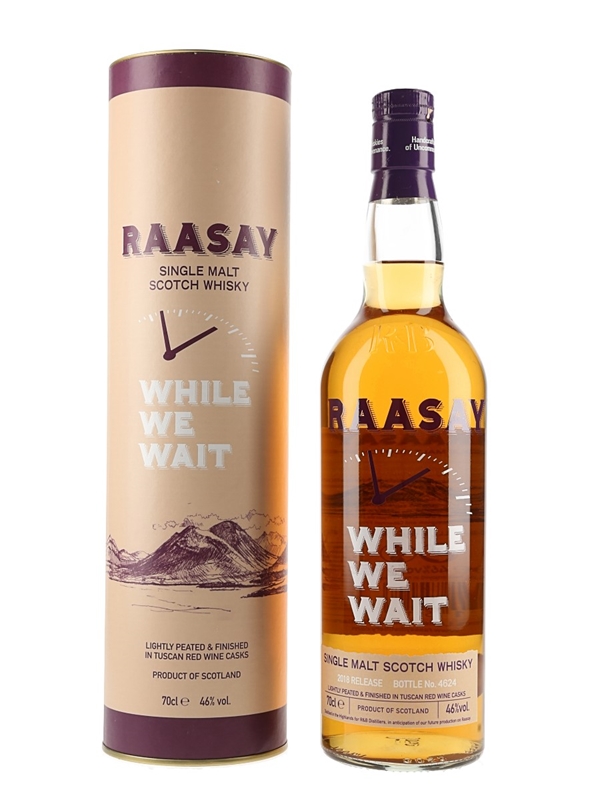 A 2018 Release bottle of Raasay While We Wait single malt Scotch whisky produced and bottled for R & B Distillers by a Highland distillery. This was finished in Tuscan red wine casks.