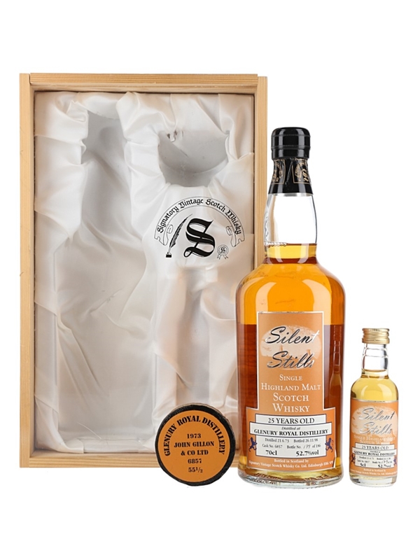 A bottle of Glenury Royal 25 Year Old Single Highland Malt Scotch Whisky. This was distilled on 21 June 1973, matured in a single cask and bottled on 26 November 1998 by Signatory Vintage for the Silent Stills series. This is presented in a wooden box, and contains a 70cl bottle, 5cl miniature and replica bung.