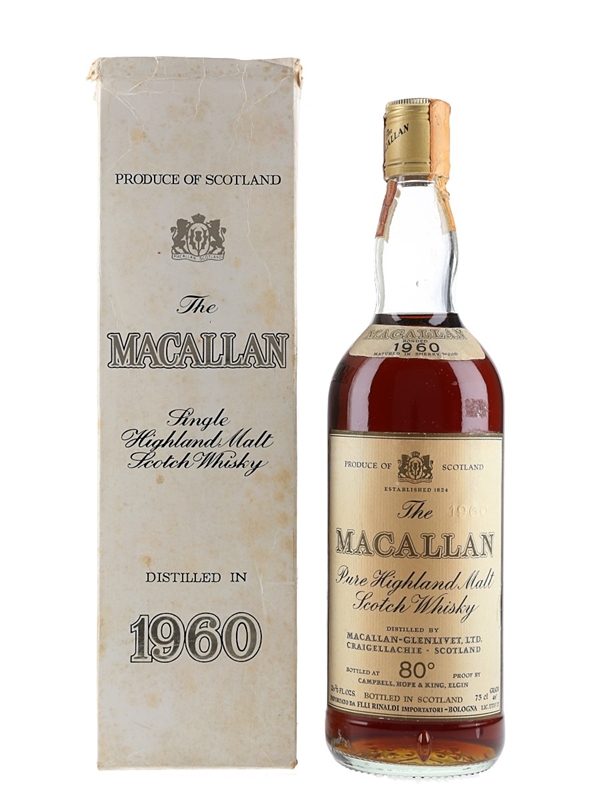 A bottle of The Macallan 1960 Single Highland Malt Scotch Whisky, matured in sherry wood and bottled by Campbell, Hope & King. This was bottled for the Italian market and imported by Rinaldi, we estimate in the 1970s.