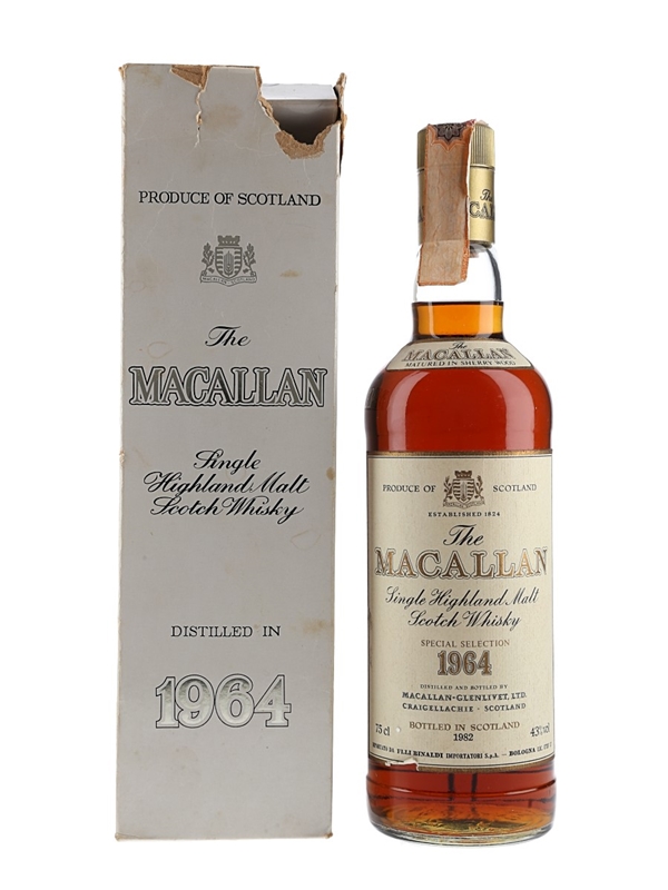 A bottle of The Macallan 1964 Single Highland Malt Scotch Whisky, matured in sherry casks and bottled in 1982 for Italian importer Rinaldi.