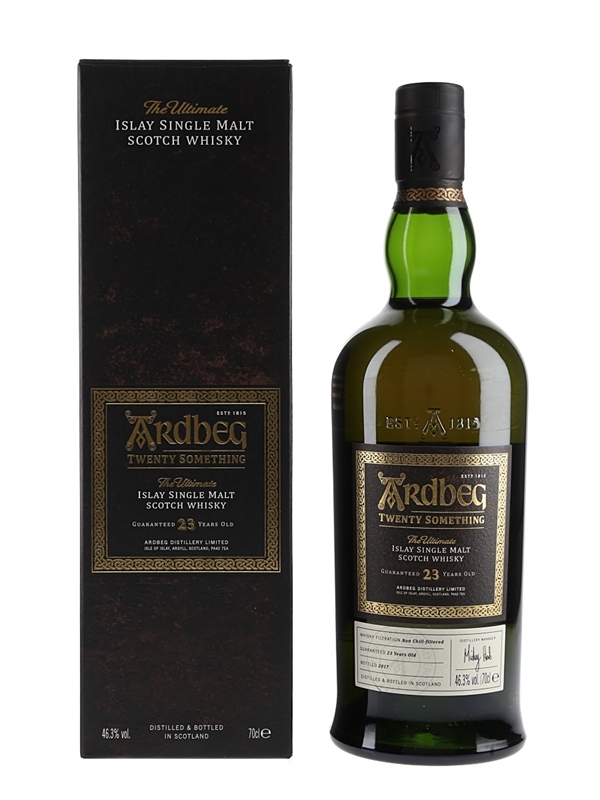 A bottle of Ardbeg Twenty Something The Ultimate Islay Single Malt Scotch Whisky, a 23 Year Old expression, bottled at 46.3% ABV in 2017 for Ardbeg Committee members.